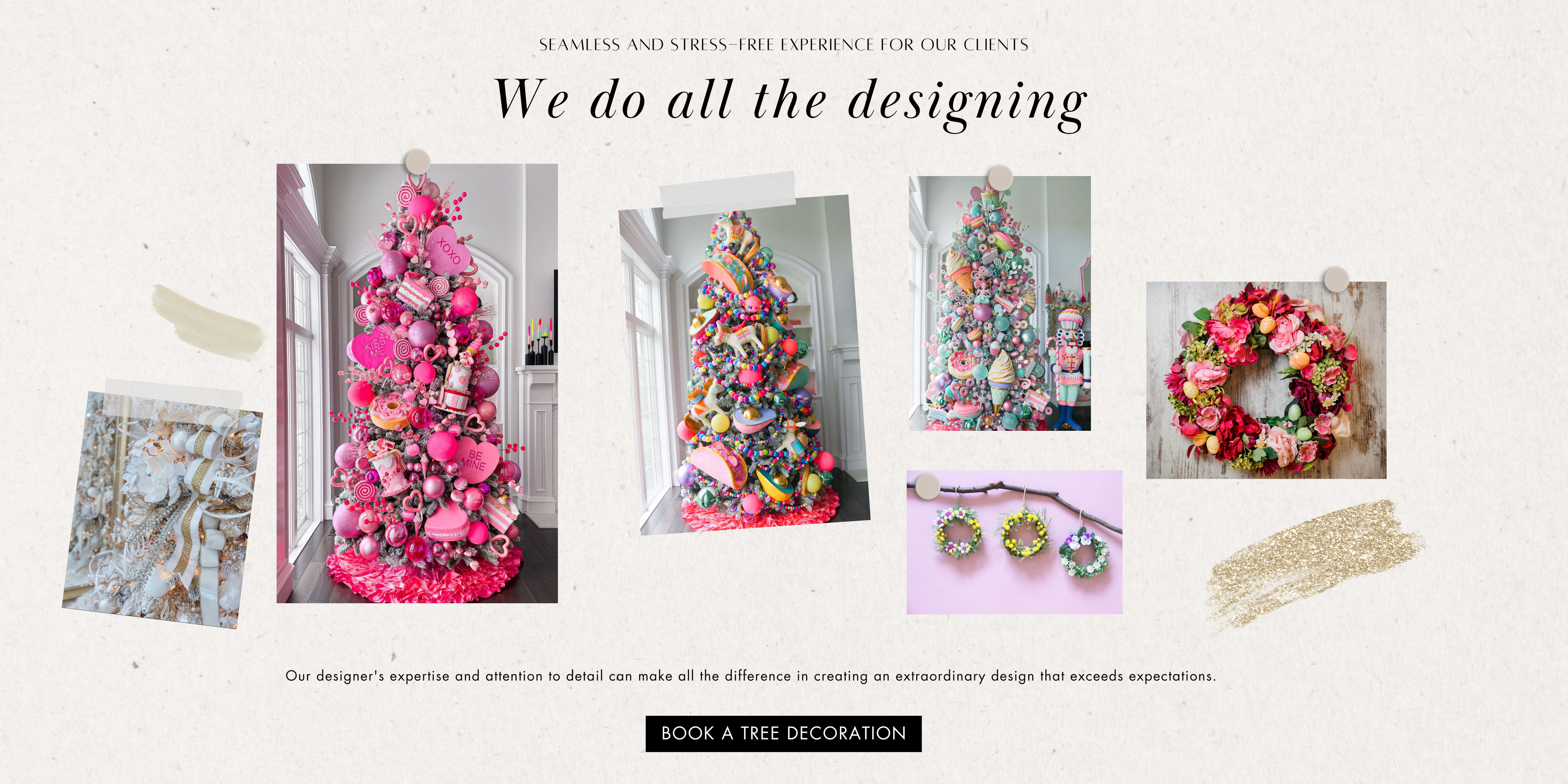 The process typically begins with a consultation to discuss the client's preferences and budget. We will then provide suggestions and recommendations for decorations and create a design plan for the tree. We will also provide guidance on the appropriate size and style of tree for the space.